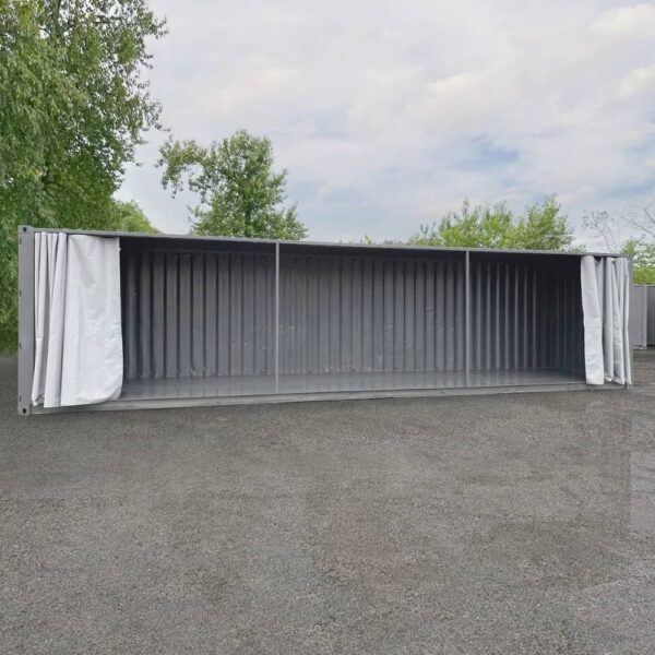 Conteneur 40′ High Cube modifié avec ouverture latérale complète. D’occasion, repeint en gris ardoise, renforcé par poteaux HSS. Idéal pour espace pro, stockage ou projet événementiel.