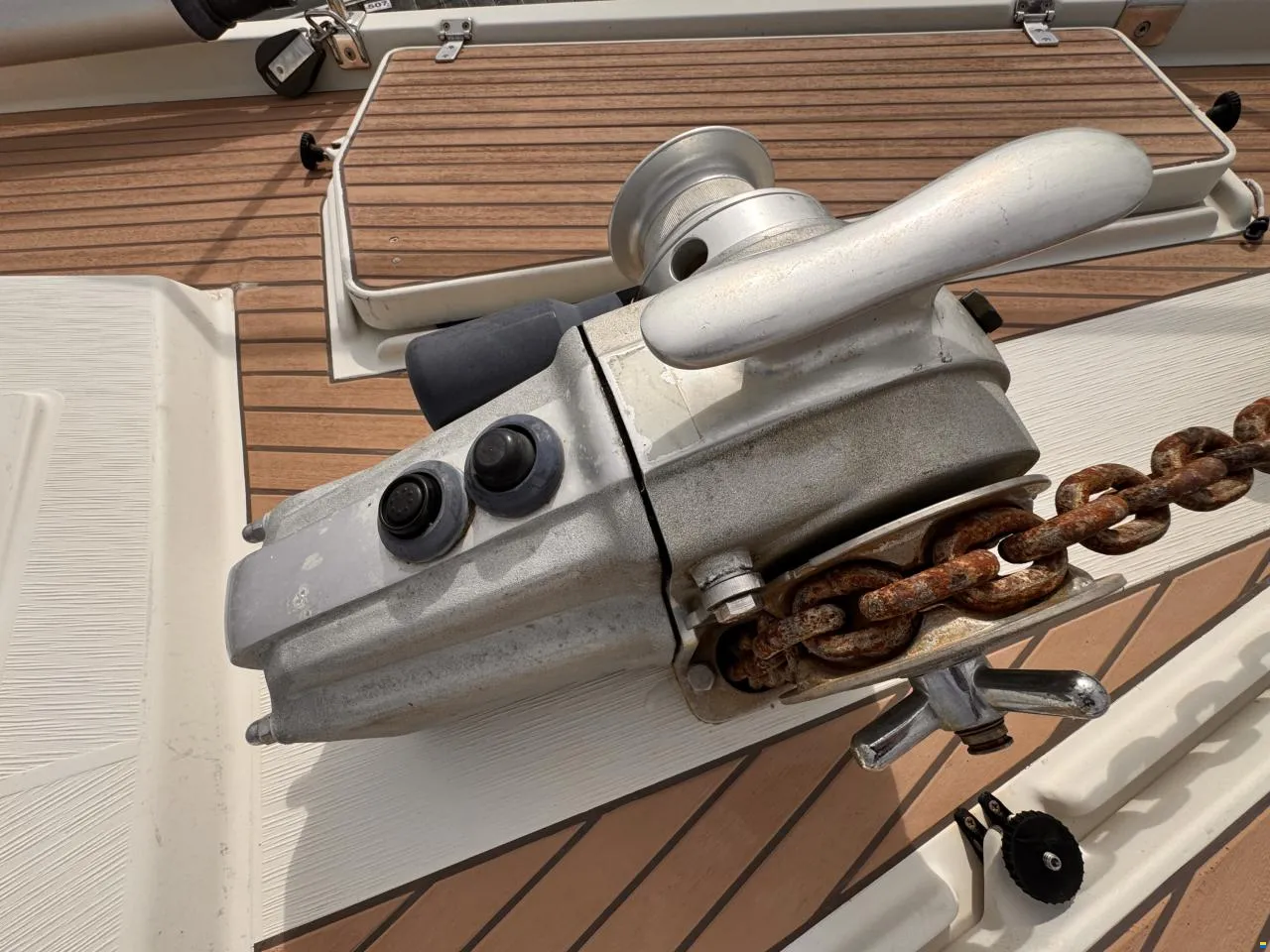 Côté navigation, il est équipé d’un mât en aluminium avec grand-voile, foc et génois sur enrouleurs, ainsi que de 3 winches électriques pour une manœuvre facilitée. Deux pilotes automatiques Raymarine assurent une navigation confortable même sur de longues distances.