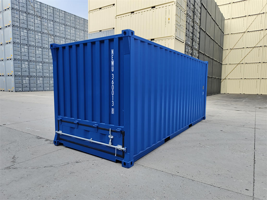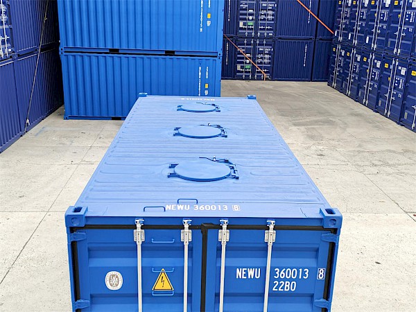 Conteneur 20’ Bulk DV – 32 m³. Trappes de toit (x3), trappe de vidange frontale, plancher acier 4,5 mm, poignées, fourreaux. Idéal vrac sec. Bleu RAL 5010, certifié CSC.