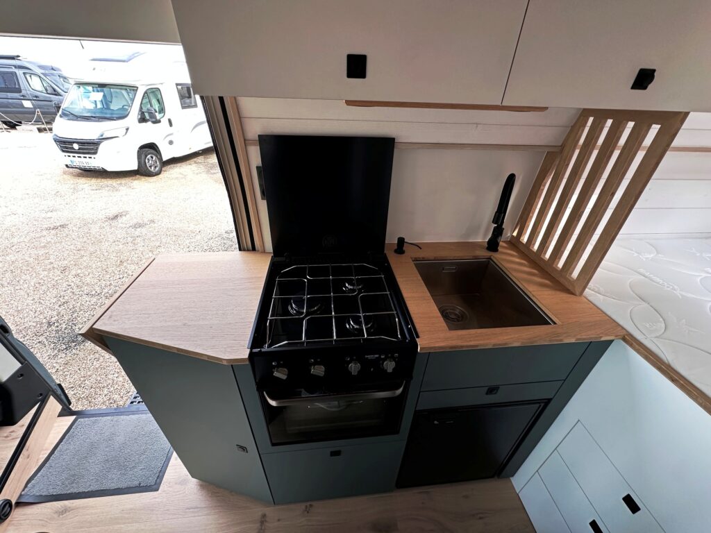Van premium Vandesigners de 2023, 4 couchages, lit transversal + toit relevable Skyup. Motorisation 180 CV BVA 9, aménagement sur mesure, soute avec espace surf, cuisine haut de gamme, salle d’eau modulable. Seulement 3 400 km, 1ère main, état neuf.